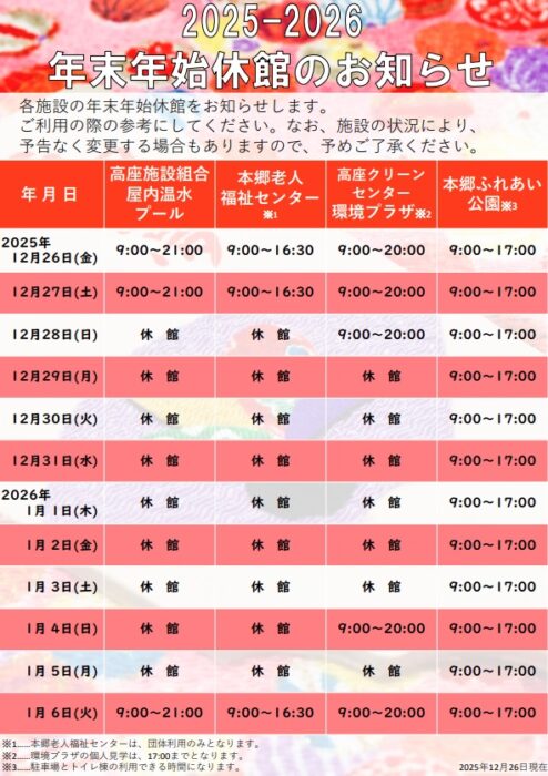 2025年12月26日 2025-2026 年末年始休館のご案内 新着情報 高座施設組合屋内温水プールの年末年始休館のお知らせです。 ●年末年始休館期間 12月28日(日)~1月5日(月) 温水プールは、年内12月27日(土)が最終開館日となり年明けは1月6日(火)9:00~開館します。 本郷老人福祉センター、環境プラザ、本郷ふれあい公園との合同年末年始休館のお知らせを取りまとめましたので、 ご利用の際の参考にしてください。
