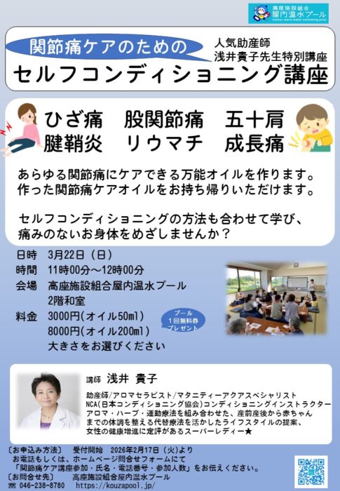 2026年2月18日 【特別講座】関節痛ケアのためのセルフコンディショニング講座 新着情報 産後ケアホテルマームガーデン葉山のアドバイザー 助産師 浅井貴子先生をお招きしての特別講座となります。 この機会にぜひご参加ください。 R8.3月関節痛オイルポスター R8.3月マタニティハイドロペアレッスン