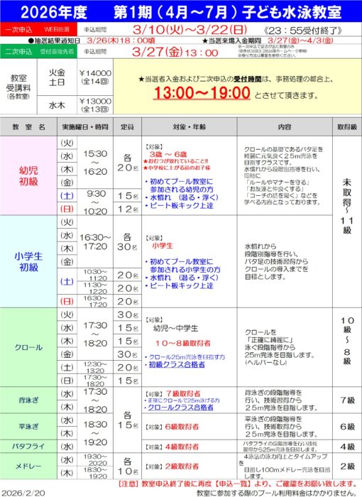 ●2025年度 1~3月第3期こども水泳教室 定員情報 Web申込は終了しました。