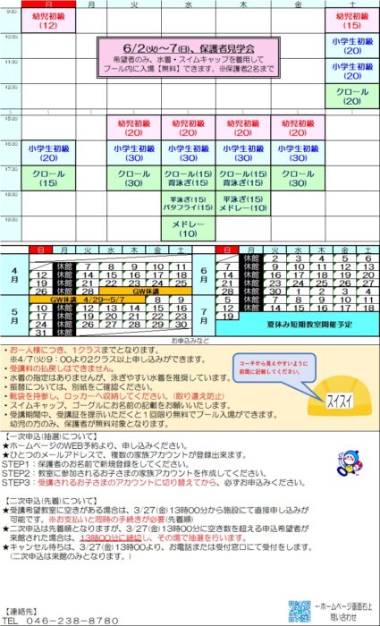 ★受講希望教室に空きがある場合は 3/27 13時~施設にて直接お申込みが可能です。(先着順)