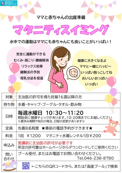2026年4月3日 マタニティスイミング案内 新着情報 イベントのご案内 教室からのお知らせ ●一般入場時もマタニティー水着レンタルを、1回200円にて実施しております。 マタニティチラシ最新版 入会申込書(PDF) 妊娠運動許可書(PDF)