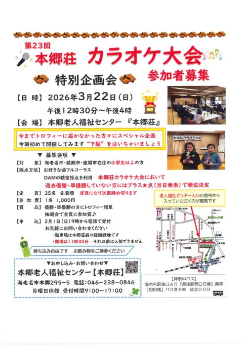 - 海老名市、綾瀬市、座間市在住の高齢者(60歳以上)を対象に、健康増進、趣味・教養の発表の揚、さらにグループやサークルを通じた楽しい語らいの場として、ご利用いただける老人福祉施設です。