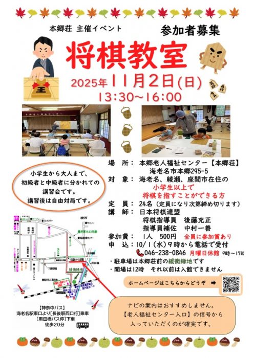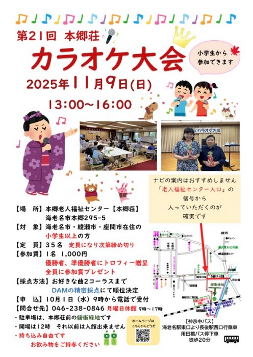 - 海老名市、綾瀬市、座間市在住の高齢者(60歳以上)を対象に、健康増進、趣味・教養の発表の揚、さらにグループやサークルを通じた楽しい語らいの場として、ご利用いただける老人福祉施設です。